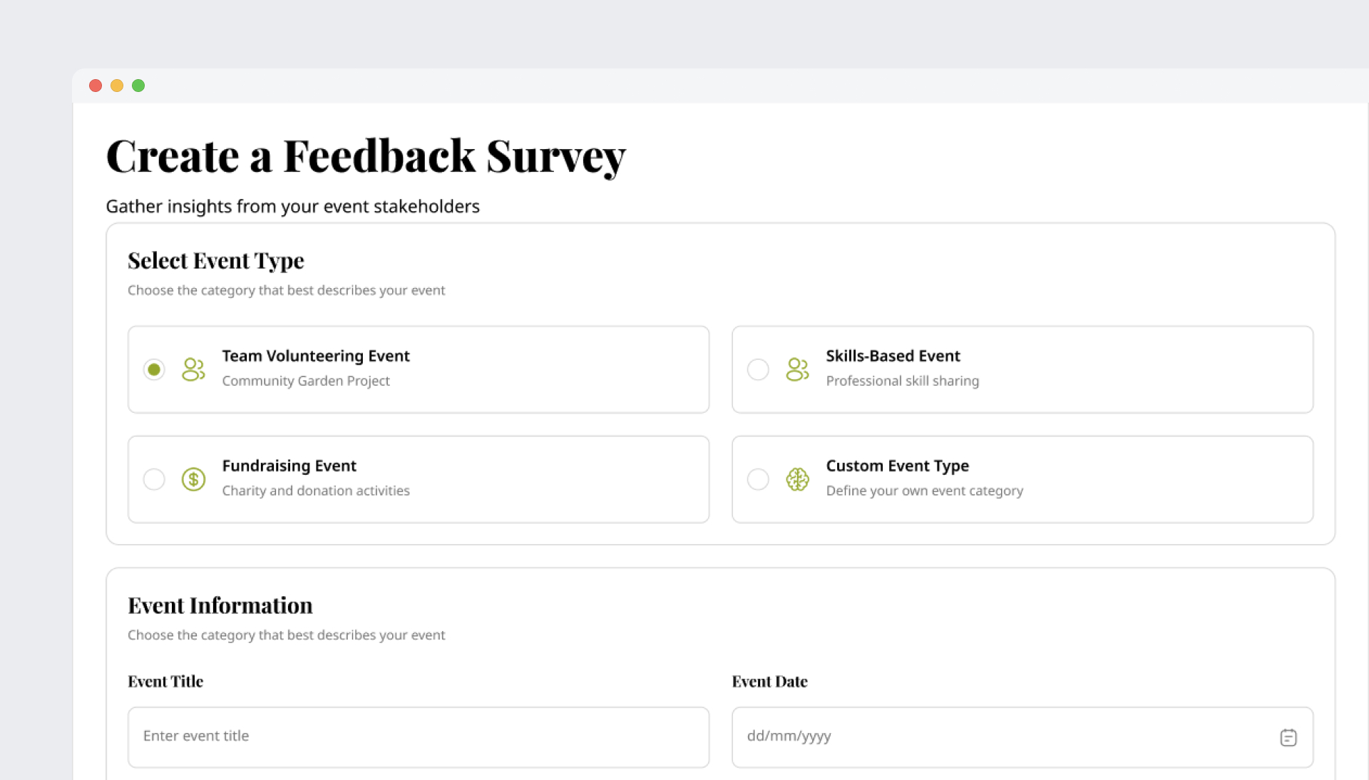 Add event details, partners, and the stakeholder groups you want to survey.