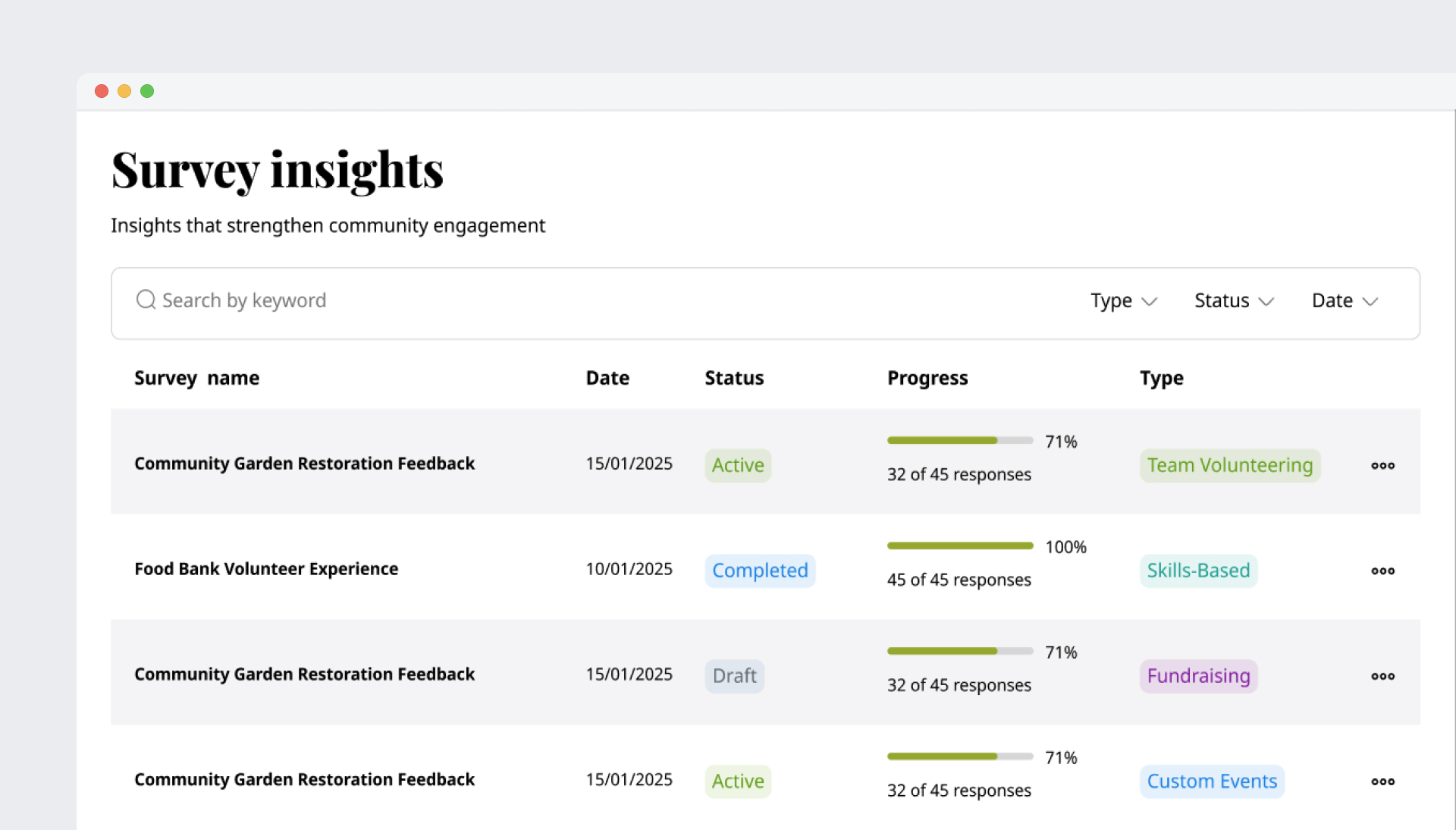 Capture responses from employees, NPOs, beneficiaries, and organizers in real time.