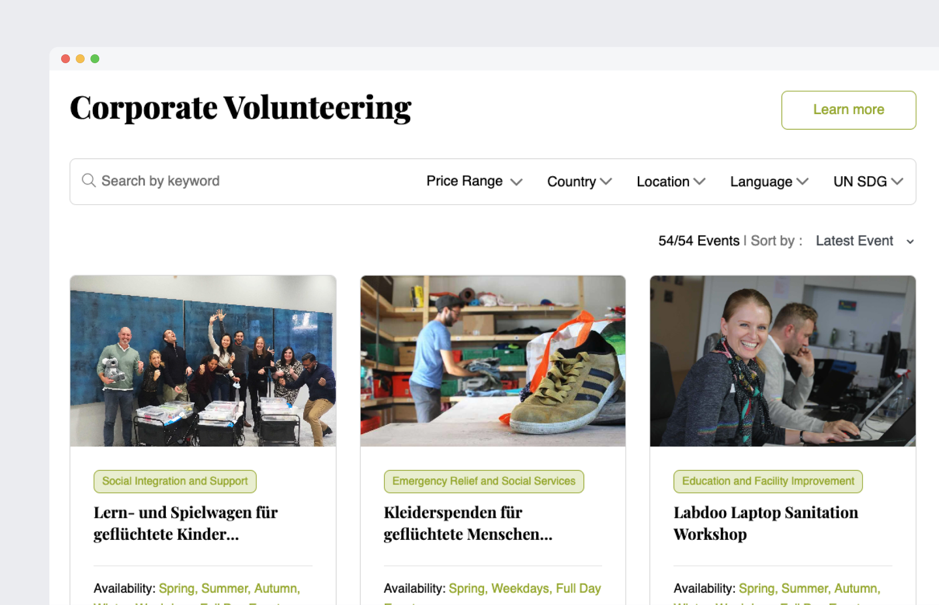 Employees explore volunteering opportunities in one place and quickly understand what each activity involves, why it matters, and how they can take part.
